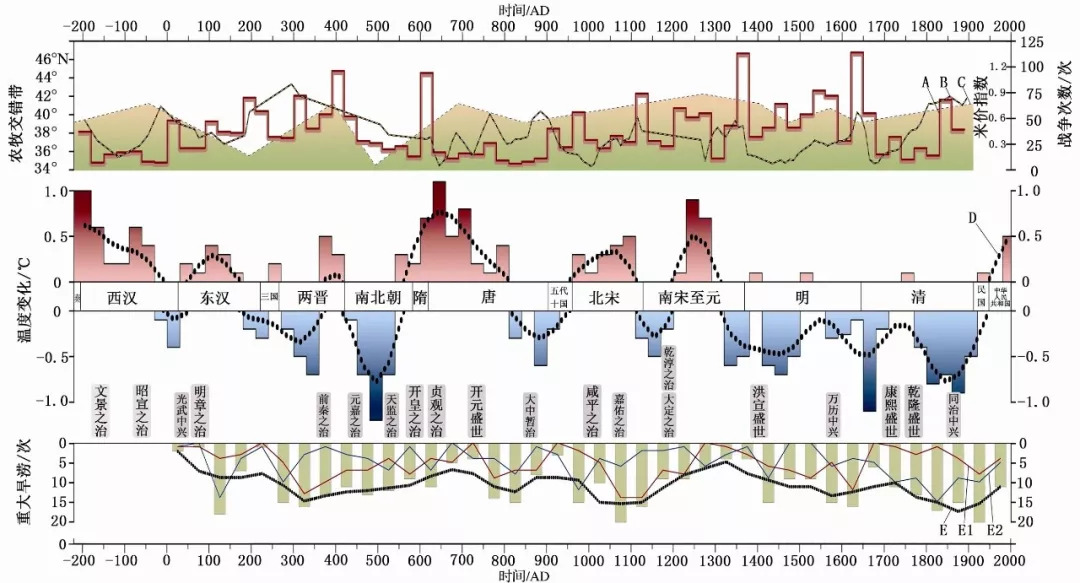 那什么时候这个炸弹掉下来呢?竺可桢于1973年在人民日报发表了一篇伟大的文章:”中国近五千年来气候变迁的初步研究“。竺可桢从中国历史的文献及西方的一些气象研究推出了中国近五千年来气候的变迁。这篇文章藏着中国文明兴衰的密码。一般来讲,如果气候比较暖和,漠北雨水也会多一点,漠北草原上的人过着很浪漫的生活, 如敕勒川所云:敕勒川,阴山下,天似穹庐,笼罩四野,天苍苍,野茫茫,风吹草低见牛羊。中原地方粮食生产和人口也会增加。如果气候比较寒冷,漠北雨水少了,牛羊马就没有那么多草吃,以前那么多的人也成了问题,最好的办法就是骑士们骑上快马一起到南方去打劫中原的人去。
