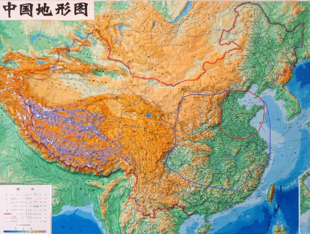 小的规模看,北依燕山,南至大别山和淮河,西起太行,东到海,是河南河北山东安徽江苏所在的华北平原,也就是我们常说的中原,如一个大盆地,参见中国地形图红圈;再往外一圈,往西越太行山骑秦岭直抵青藏高原的边沿,往南渡淮河长江乘湘江赣水直达南岭,是华北平原加上山西陕西四川湖南北江西浙江,是一个更大的大盆地,参见中国地形图蓝圈。这个大盆地,是地理文化上的中国,地域上相当于灭六国时候的秦国。南北东西纵深辽阔,气候复杂,里边又是一个小盆地接一个小盆地,大盆地套小盆地,为动植物和文化发展多样性提供了充分的地理气候条件,也为防御外文明的入侵提供了数量的优势和和战略纵深的空间。人类文明在中国出现不是最早,比如进入农业社会比中东晚了几千年,国家文字也晚了上千年,但是从商周汉到明清民国,中国文明可以发展壮大三四千年延续至今,亡而复兴者数次,这是人类文明历史中的奇迹。历史上的文明来来去去,唯中国文明可以善存数千年,这个不是偶然的。