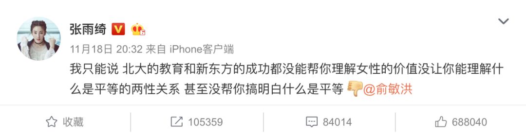 演员张雨绮直接发微博称:“北大的教育和新东方的成功都没能帮你理解女性的价值,没让你理解什么是平等的两性关系,甚至没帮你搞明白什么是平等。”