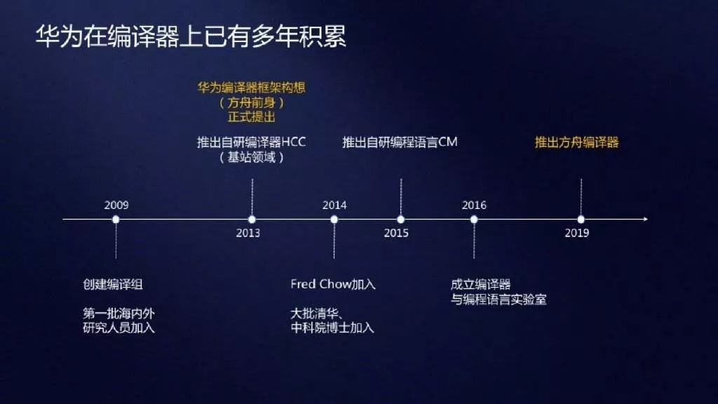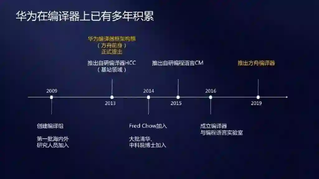 方舟编译器是今年4月P30系列发布会上才正式公布的技术。据华为西研所专家透露,早在2009年华为启动5G基础技术研究的同时就成立了编译组,2014年方舟项目正式启动、2016年成立了编译器与编程语言实验室,直到2019年正式对外公开。此前,华为已经宣布将会开源方舟编译器。