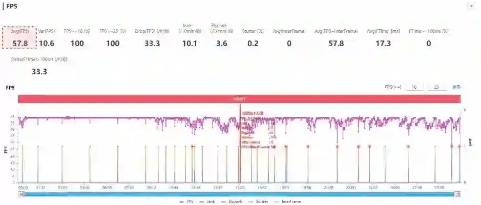 Y700 搭载了一颗骁龙 870,具体表现如何呢?同样半小时的《原神》,平均帧率居然达到了 57.8,并且表现稳定。