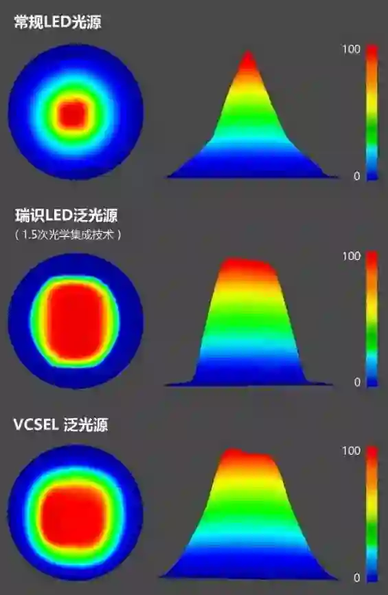 所以瑞识设计了“1.5次光学集成”,提升产品光强分布的均匀度,通过多层光学界面配合处理LED近似朗伯型光源的光路,获得光强分布均匀的光斑,保证光源对目标物体的均匀补光,达到了类似VCSEL泛光源的效果。