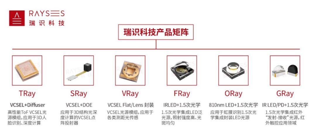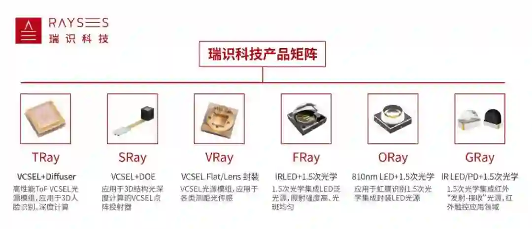 基于上述技术方案,瑞识科技开发了VCSEL光源模组VRay(VCSEL+透镜)、高性能ToF VCSEL光源模组Tray、用于三维结构光深度计算的VCSEL点阵投射器SRay,以及“1.5次光学集成”封装的LED光源产品。
