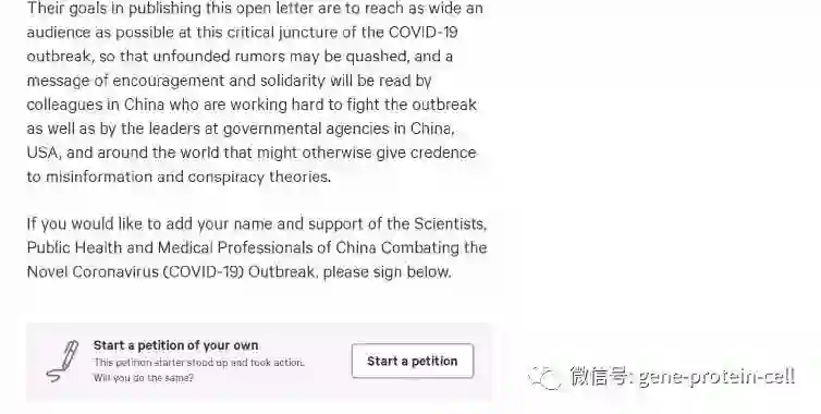 文中邀请全球广大科技工作者加入声明,“我们邀请其他人加入我们,支持武汉和中国各地的科学家、公共卫生专业人员和医疗专业人员。与前线同事并肩作战!我们用同一个声音说话。为了增加您对这一声明的支持,请在线签署我们的信件。