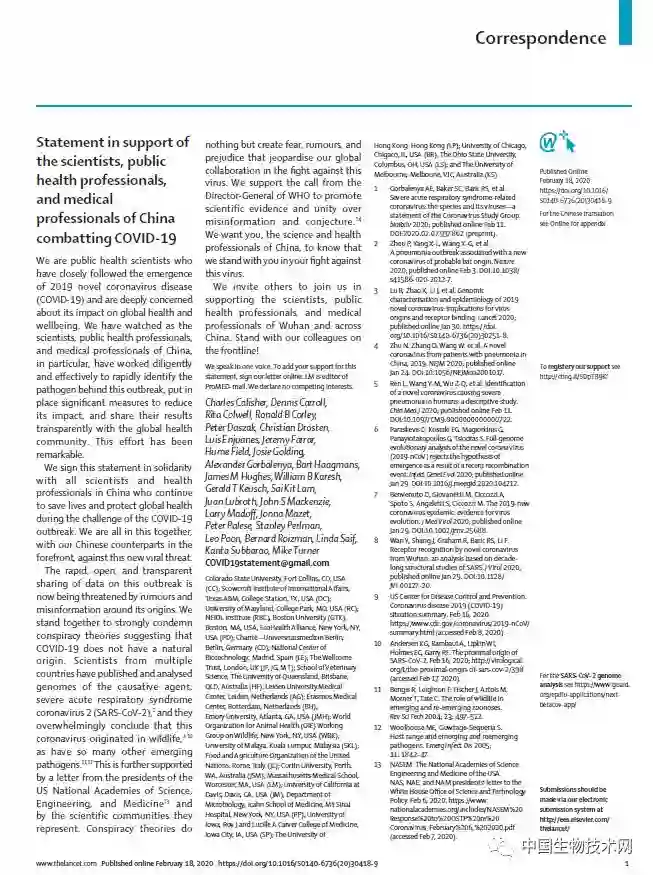 该文由来自英、德、美、澳、荷兰、西班牙以及马拉西亚、中国香港等全球著名科研单位的27名病毒学家、流行病学家联合发表,通讯邮箱为COVID19statement@gmail.com。