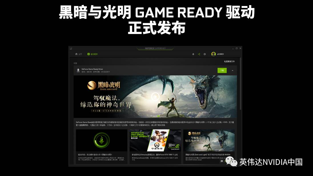 最新的GeForce Experience支持《黑暗与光明》的Game Ready驱动,这是一款来自中国蜗牛游戏的游戏,它带来非常强的玩家参与感。新版的GeForce Experience也为中国最热门的前100款游戏中的86款做了优化。