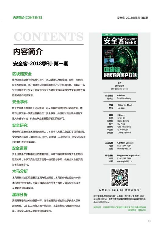 慢雾安全团队、浅黑科技、平安银河实验室、freebuf、破壳社区、思锐嘉德、逢魔实验室、看雪、唯品会SRC、小米安全中心、简书、启明星辰、长亭科技、蚂蚁金服巴斯光年安全实验室等数十个安全团队及安全平台的优质技术文章,才最终汇集而成安全客本季季刊。