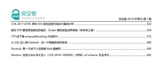 2017年年初,安全客的第一版电子年刊正式出版,一经发布立刻在安全圈内掀起一番读书热潮。今天安全客2018年第一季度季刊正式和大家见面,截至本次已经发布了6版,并且在上一季度中,安全客季刊创下累积370000+的下载量,这是安全客一直坚守质量为本、干货为首的成果凝集,也是安全客用户和白帽伙伴对季刊品质的认可,我们在此次季刊中,也将秉承严格把控质量的原则,为大家呈现最优质、最热门的技术分享内容。
