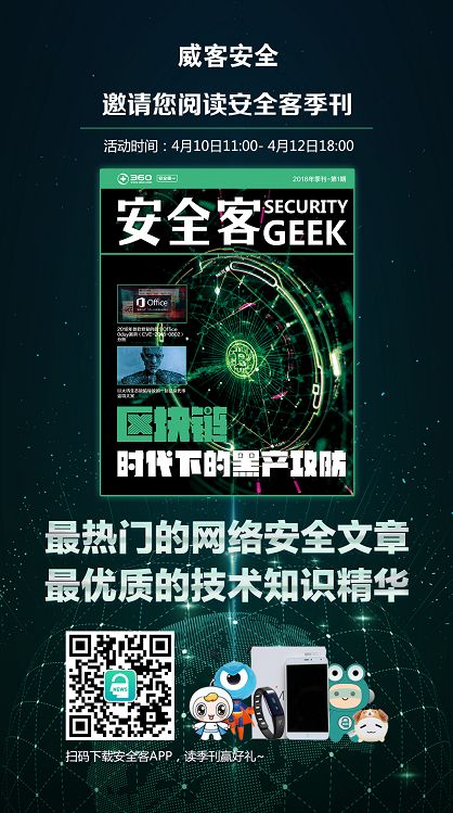 4月10日,安全客2018季刊—第1季再度上线,我们对文章的质量严格把关,对品质始终恪守不渝,只愿为安全爱好者带来最好的干货!从4月10日的11点到4月12日的18点,我们还将放送出1000+份定制好礼,赶快下载安全客最新APP,来一起参与吧!