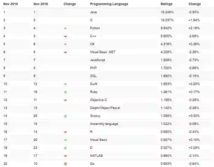 根据最新的榜单显示,相比上个月编程语言 Top 5 并没有太大的变化,其中 Java 依旧稳坐榜首,随后分别是 C、Python、C++、C#。