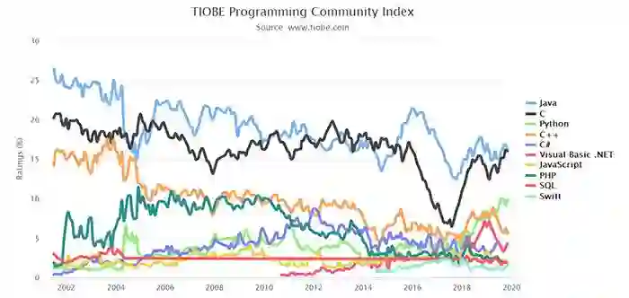 Top 10 编程语言 TIOBE 指数走势(2002-2019)