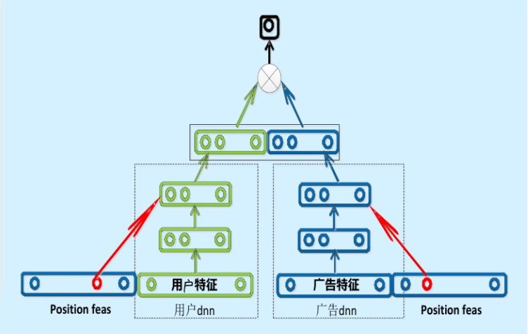 现在业界的很多公司其实采用了“复杂网络离线训练,生成 embedding 存入内存数据库,线上实现 LR 或浅层 NN 等轻量级模型拟合优化目标”的上线方式。百度曾经成功应用的“双塔”模型是非常典型的例子(如图 1)。