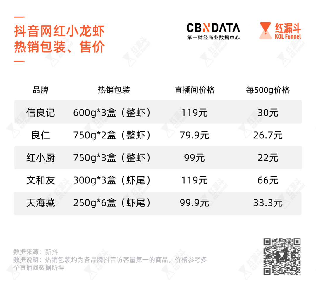 信良记、红小厨、良仁的热销商品都是整虾,最便宜的红小厨1斤22元,最贵的信良记1斤30元。食用方便的虾尾差价更大,文和友1斤虾尾要价66元,天海藏却低至1斤33元,仅比信良记整虾高3元。