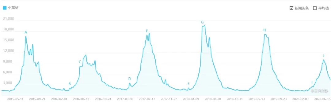 往年数据显示,小龙虾的搜索热度在达到最顶点的那一刻就开始断崖式下滑。每年小龙虾的热度都集中在5月初到6月中旬,而今年小龙虾的人气直接“腰斩”,声势大不如前。