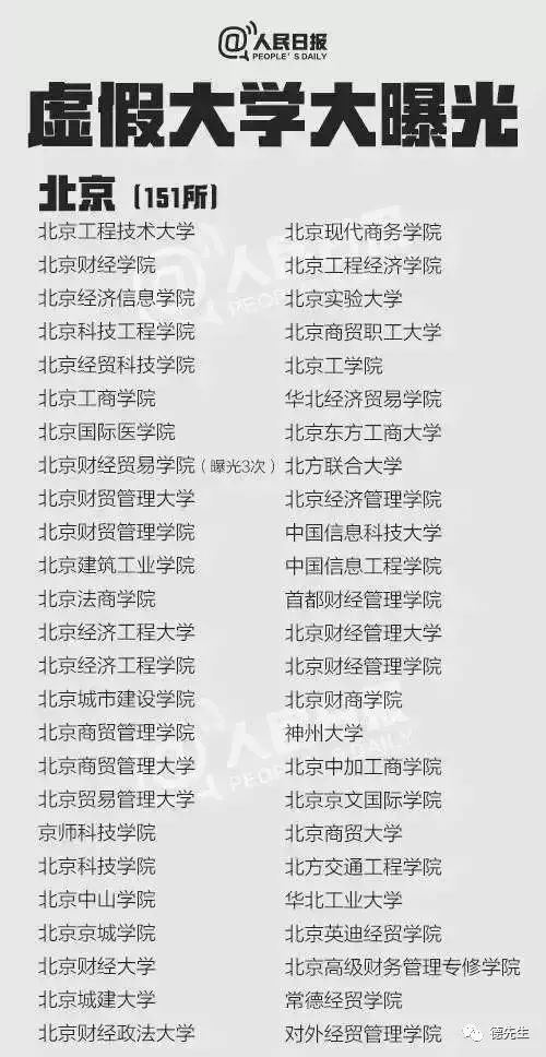 在这些“野鸡大学”中,北京共有151所。我们发现,“野鸡大学”的名字都和正规大学相差无几。比如,把北京邮电大学改成“中国邮电大学”,反而更显高端;把中国传媒大学改成“中国传媒艺术学院”,反正,传媒和艺术是紧挨在一起的。