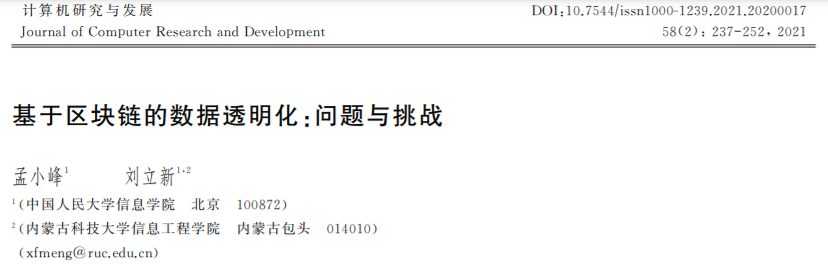摘要: 物联网、穿戴设备和移动通信等技术的高速发展促使数据源源不断地产生并汇聚至多方数据收集者,由此带来更严峻的隐私泄露问题, 然而传统的差分隐私、加密和匿名等隐私保护技术还不足以应对.更进一步,数据的自主汇聚导致数据垄断问题,严重影响了大数据价值实现.此外,大数据决策过程中,数据非真实产生、被篡改和质量管理过程中的单点失败等问题导致数据决策不可信.如何使这些问题得到有效治理,使数据被正确和规范地使用是大数据发展面临的主要挑战.首先,提出数据透明化的概念和研究框架,旨在增加大数据价值实现过程的透明性,从而为上述问题提供解决方案.然后,指出数据透明化的实现需求与区块链的特性天然契合,并对目前基于区块链的数据透明化研究现状进行总结.最后,对基于区块链的数据透明化可能面临的挑战进行分析.