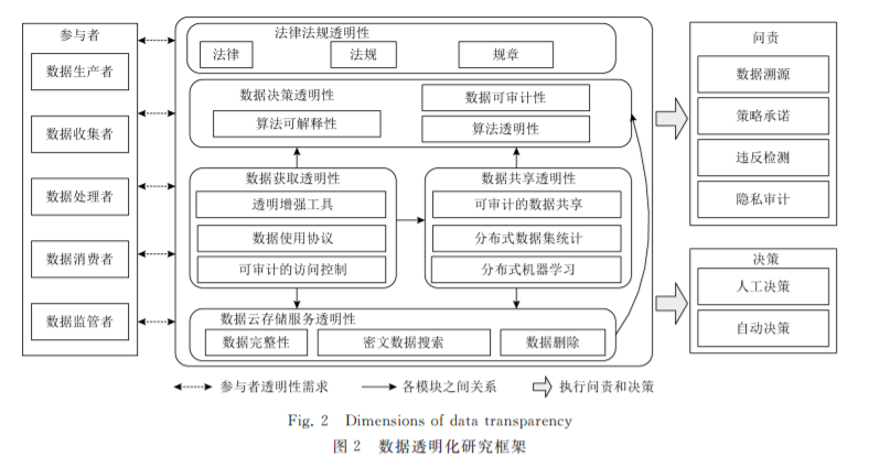 增加大数据价值实现的透明性,是促进大数据 正确使用的重要举措和必经之路.据此,本文提出数 据透明性的概念,指在大数据价值实现过程中,各个 参与方都能获取与自身相关的全部数据信息.并将 数据透明性分为数据获取透明性、数据共享透明性、 数据云存储服务透明性、数据决策透明性和法律法 规透明性5个部分,通过这5个部分实现数据透明 化.数据透明化需要公开透明地记录数据的获取和 共享流通等信息,以及去中心化地管理数据和执行 数据质量管理.这些需求与区块链的特性天然契合, 而且区块链的去中心和不可篡改特性使数据透明化 具有更强的问责能力.