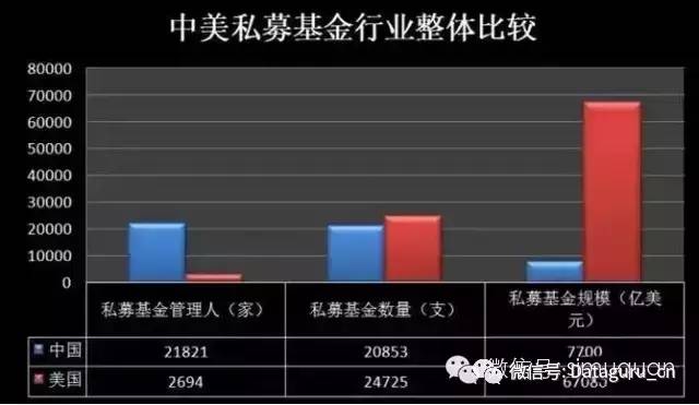 在中国全部私募基金管理人之中,扣除15968家资产管理为零的机构,剩余5982家。这5982家机构平均管理资产规模为8.17亿人民币(1.29亿美元)。而美国同行的平均管理净资产规模为158.12亿人民币(24.9亿美元)。美国私募基金管理人为中国的20倍。