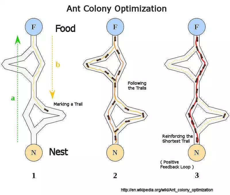 蚁群利用一个复杂的算法确定了最短路径。早在蚁学家用语言记下这种现象之前,蚂蚁就很好地运用了这个进程。