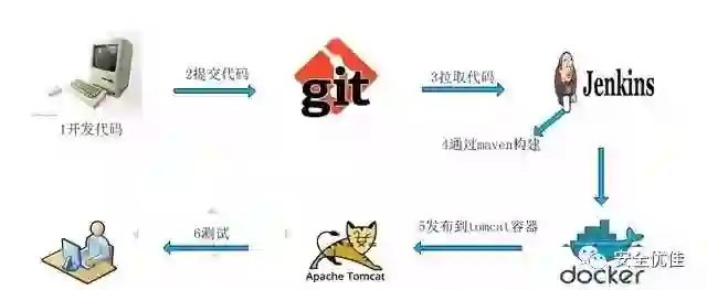 Java 项目开发 -> 提交项目代码 Git 容器 -> Jenkins 容器拉取项目代码 -> Maven 编译构建项目 -> Jenkins 发布项目到 Tomcat 容器 -> 测试