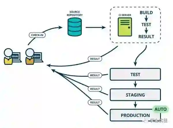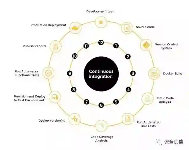 开发团队 -> 源代码编码(开发语言)-> 代码版本控制(Gitlab) -> Docker 构建(创建镜像)-> 静态代码分析(白盒测试)-> 自动化单元测试 -> 代码覆盖率(覆盖率测试)-> Docker 版本(发布到容器)-> 提供部署到测试环境 -> 自动化功能测试 -> 发布报告 -> 生产部署