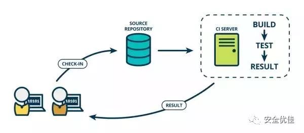 CI 过程:代码编写 -> 源代码库(GitHub or gitlab)-> CI 服务器(代码构建、自动化测试、结果反馈【构建结果】)