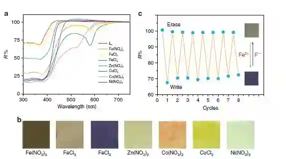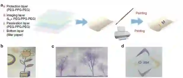 黄维团队还使用聚乙二醇-聚丙二醇-聚乙二醇材料(PEG-PPG-PEG)来改进可复用纸的四层结构以增强其实用性(参见图3-a)。 PEG-PPG-PEG具有良好的水溶胀能力,促进了MSAS的渗透,从而可增加金属离子与配体的配位几率。可复用纸包括四层结构:底层为作基材的滤纸;第二层是由PEG-PPG-PEG构成的钝化层,直接与纸基材接触,作为配位体与纸面之间的隔离带;中层是作为成像层的PEG-PPG-PEG和配体;顶层是作为保护层涂覆在顶端的表层PEG-PPG-PEG。由于PEG-PPG-PEG + L1是无色的,所以可复用纸的原始颜色与滤纸的颜色一致。加入不同的MSAS后,使用反射式UV-Vis光谱仪测量可复用纸张(见图2-a)。如图2-b所示,在可复用纸张上获得了七种可区分的颜色,包括褐色,卡其色,深蓝色,淡黄色,橙色,黄色和浅绿色。此外,研究发现当Fe2 +与L3配位时可以获得黑色,该发现表明通过改变配体的化学结构,可以发展出更多的颜色。