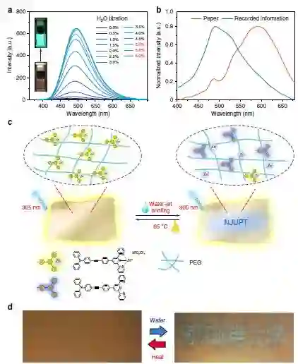 除了用Zn-L3代替成像层成分并将聚合物基质变为PEG之外,水射流可复用纸的制造工艺与前文介绍的相同。而将PEG-PPG-PEG替换为PEG的原因在于,后者不仅表现出较好的水溶胀能力,还具有较低的熔点。水可以渗透过PEG保护层,然后解离配位键。图4显示,所制造的可复用纸可成功用于市售喷墨打印机打印发光字符,只不过墨盒里面装的是水。图中 “南京邮电大学”的汉字即是通过这种方法印刷而成的。在白天,纸上的打印内容几乎不可见,但这些隐藏的字符在紫外光下却发出了蓝绿色的光芒。在以前的研究中,人们认为水分蒸发后打印内容也会随之消失。但出乎人们意料的是, Zn-L3可复用纸上的打印内容即使在水分蒸发后也能保持原样,并且留存长达6个月之久。研究人员推测这可能是由于PEG可以作为固态溶剂,阻止锌离子与配体之间解离后的再次相互作用。但是打印内容可以通过微热来消除,这一过程在65°C下大约只需要30分钟。水射流印刷可复用纸这种长保存时间(超过6个月)的特性,大大提高了其实际应用价值。
