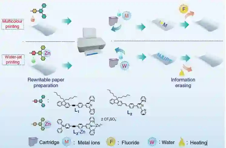 在Nature Communications上线的这篇论文中,研究者利用活性金属配体配合物键合的可逆性实现了纸张可擦写、可复用的功能,这突破了当下的技术局限。研究在滤纸上涂覆了含有三联吡啶配体的聚合物薄膜,使用可与之配位的金属盐水溶液(MSAS)作为油墨,实现彩色图像的反复喷涂。喷印的图像可以稳定留存6个月以上,而使用四丁基氟化铵(TBAF)喷涂则可解离这些配位键,达到随时擦除内容的目的。另一种可复用纸是使用纯水作为墨水喷涂,其技术原理是将能与水反应的发光锌配合物掺入到纸张的成像层中。由于水的环境友好性,水射流印刷可复用纸将会是一项重大突破。系列相关研究表明,活性金属配体配合物在可复用纸制备工艺中的应用,是实现可复用纸长保留时间多色水射流印刷的优良选择。