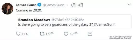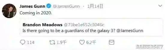 @游民星空【导演确认《银河护卫队3》2020年上映,勇度不会复活】昨日(1月15日),詹姆斯·古恩在Twitter上和网友互动,有网友问到:“《银河护卫队》会有第三部吗?”古恩则直接了当地回答:“2020年上映。”