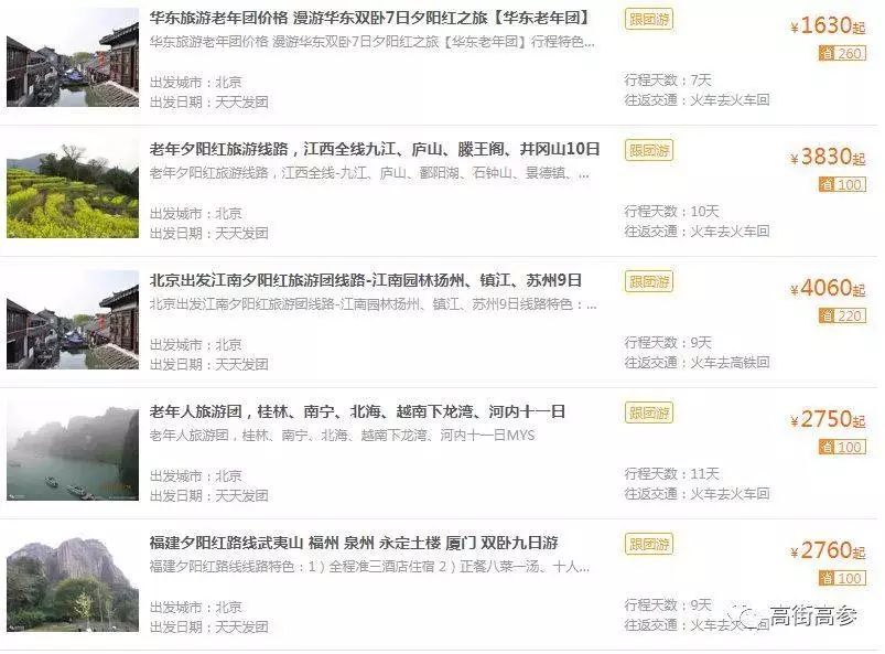 各路旅行社也借此机会施展拳脚,在考虑到老人不高的消费水平以及偏爱的线路项目后,各大旅行社纷纷推出价位低廉、漫游性质的“夕阳红旅行团”项目。
