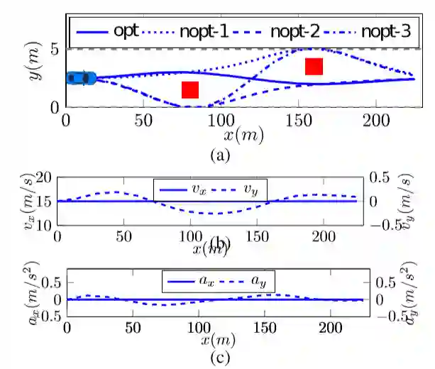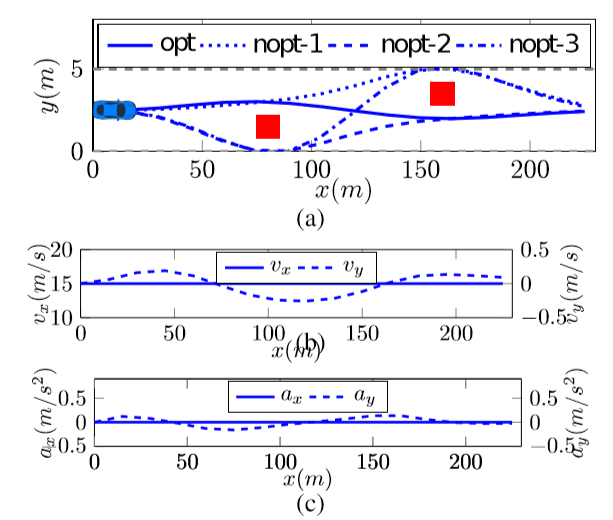 图 2 (a) 显示了全局最优轨迹和局部最优轨迹,红色方块表示障碍物,其中的代价函数值分别为,opt 3.16,nopt-1 36.1,nopt-2 37.2,nopt-3 84.67;图 2 (b)、 图 2 (c)分别显示了速度、加速度变化曲线。