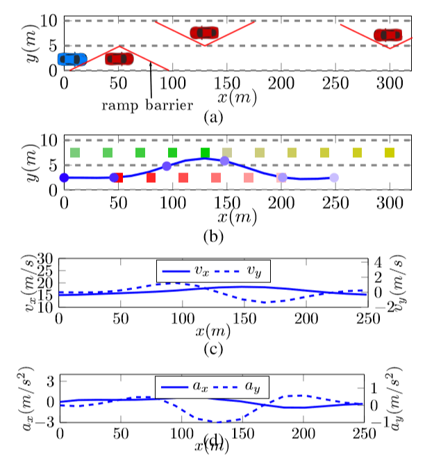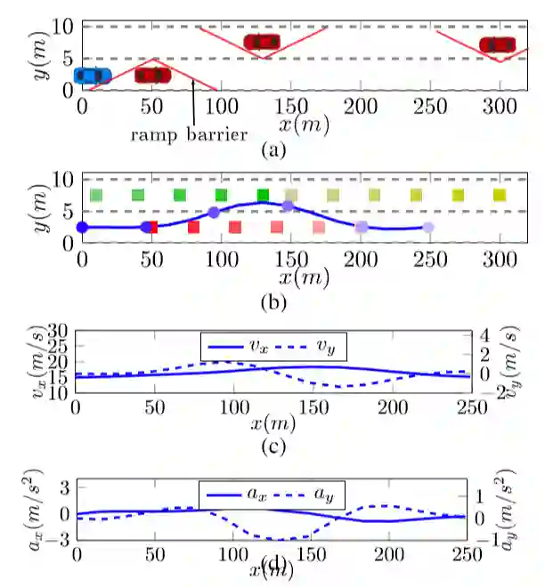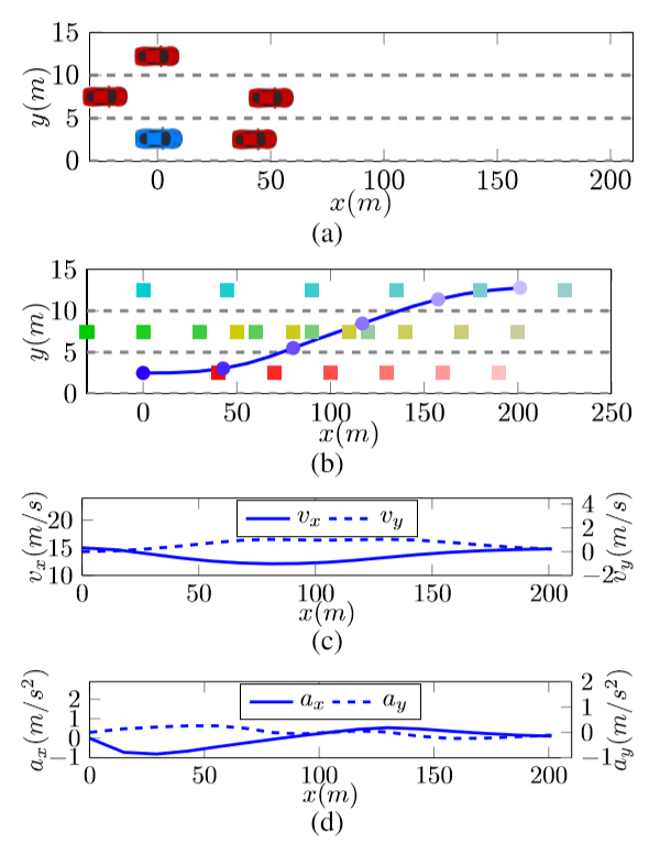 图 3 (a) 介绍了双车道超车模拟场景和超车思路,图 3 (b) 显示了自身车辆轨迹,图 3 (c)、 图 23(d)分别显示了速度、加速度变化曲线;其中,蓝色圆点代表自身车辆,不同颜色的方块代表周围其他车辆,颜色越浅,表明时间相对当前更远。