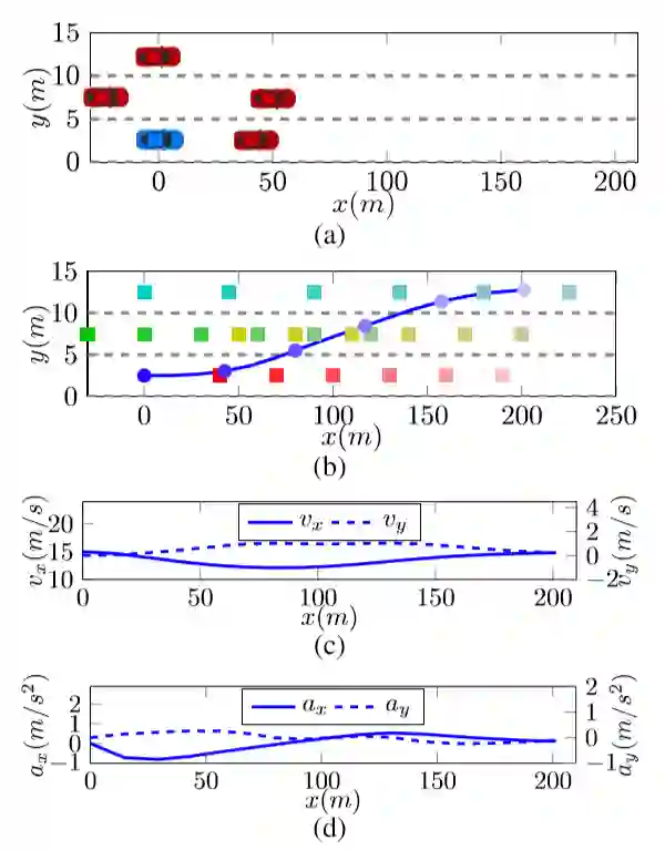 图 3 (a) 介绍了变道模拟场景,图 3 (b) 显示了自身车辆变道轨迹和其他车辆行进轨迹,图 3 (c)、 图 23(d)分别显示了速度、加速度变化曲线;其中,蓝色圆点代表自身车辆,不同颜色的方块代表周围其他车辆,颜色越浅,表明时间相对当前更远。