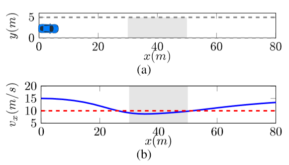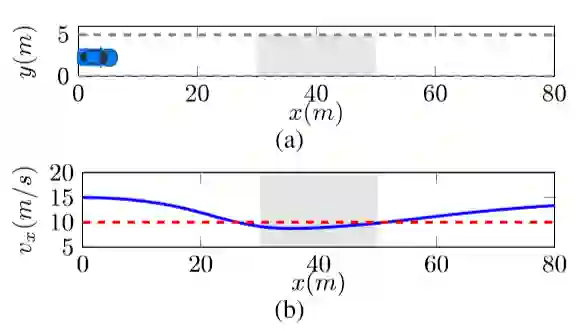 图 1 (a) 介绍了减速带模拟场景,图 1 (b) 显示规划轨迹相对于行进距离的纵向速度曲线,可以观察到车辆在[30,50]的间隔内有效地将其速度降低到小于10m / s。
