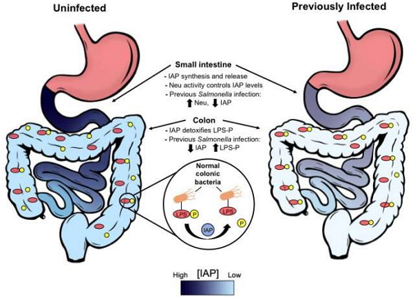 他们发现,炎症性疾病的发生与肠道碱性磷酸酶(IAP,由十二指肠分泌)缺乏有关。IAP负责去除由肠道细菌分泌的分子中的磷酸盐,从而确保这些物质由有毒转化为无毒状态。但是,沙门氏菌感染会上调小肠内神经氨酸酶的活性,进而导致IAP酶缺乏。