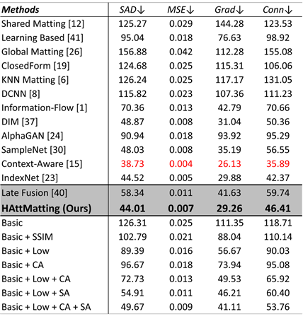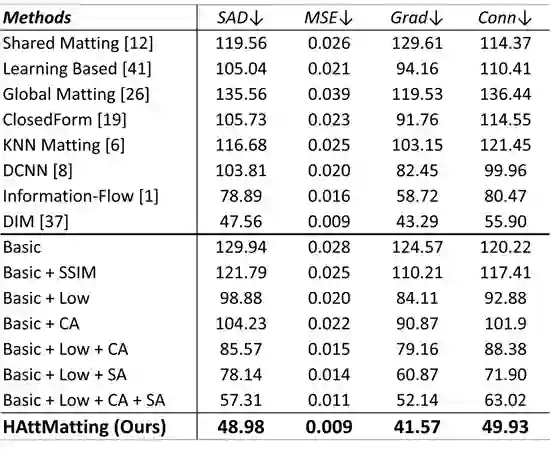 论文作者采用了Image Matting领域通用的四个评价(SAD, MSE, Grad, Conn)指标对该方法分别在 Adobe 数据集[1]和自建的