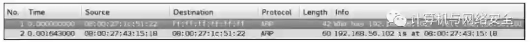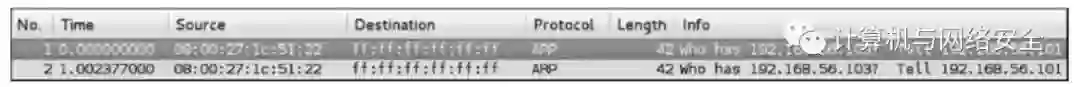 我们使用Wireshark观察arping运行期间的网络数据(见图5)。