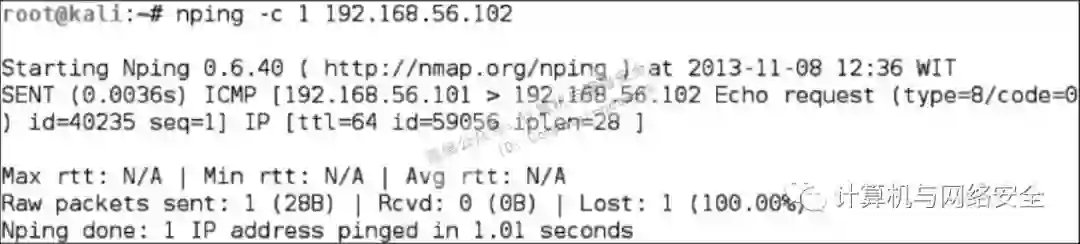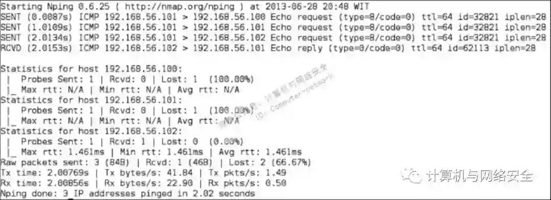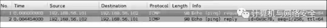 从中可以看出,我们自己的主机(192.168.56.101)向目标主机(192.168.56.102)发送了一个ICMP echo request数据包。因为目标主机在线且允许受理ICMP echo request数据包,它向我们的主机发送回ICMP echo reply数据包。