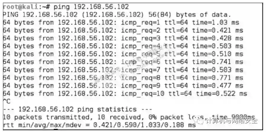 在Kali Linux 里,默认情况下在按下Ctrl-C 之前,ping 指令会一直运行下去。