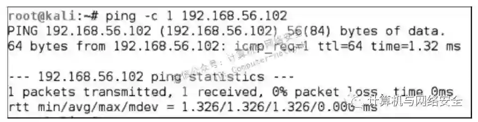 上述信息表明:ping指令只向目标主机(IP地址为192.168.56.102)发送了1个ICMP echo request;发送请求的主机(IP 地址为192.168.56.101)也只收到了1 个ICMP echo reply;请求和回复之间的往返时间是1.326ms;期间没有丢失数据包。