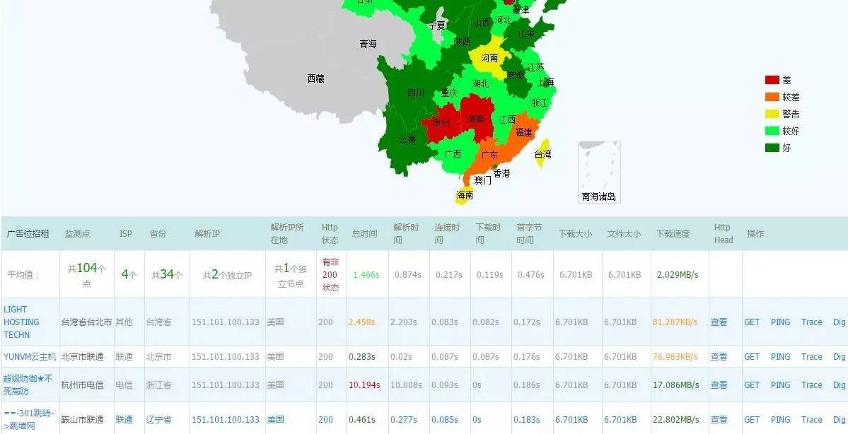 在以后的网络定位中,成了我必备使用的工具,可以非常方便的监控各个运营商、各个地区网站的访问通不通、访问的速度快不快等问题,截图如下: