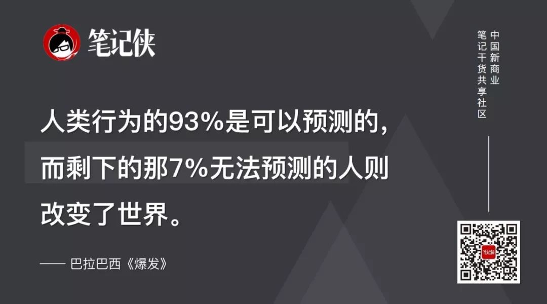 巴拉巴西在《爆发》一书中提到了这样一个观点:人类行为的93%是可以预测的,而剩下的那7%无法预测的人则改变了世界。