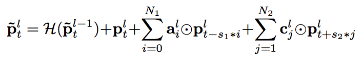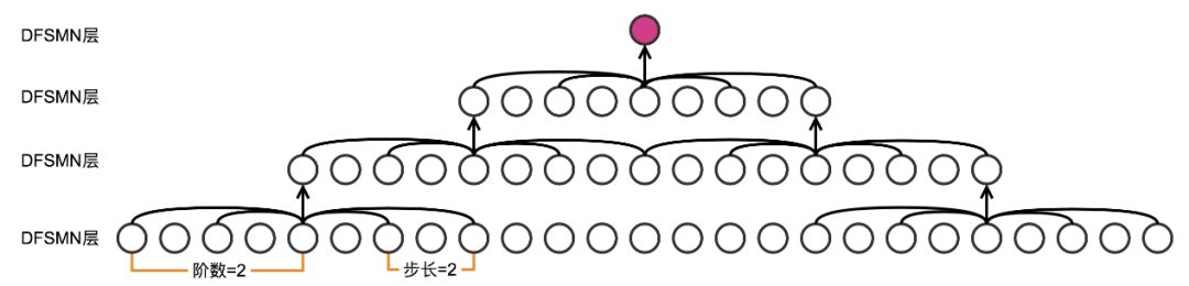 上文已经提到,除了直接增加各层的记忆模块的阶数之外,增加模型的深度也能间接增加预测当前帧的输出时模型可以利用的上下文的长度,上图给出了一个例子。