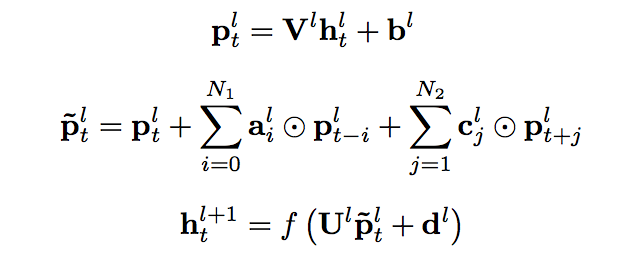 上图给出了 cFSMN 的结构的图示。对于神经网络的每一个 cFSMN 层,计算过程可表示成以下步骤①经过一个线性映射,把上一层的输出映射到一个低维向量②记忆模块执行计算,计算当前帧之前和之后的若干帧和当前帧的低维向量的逐维加权和③把该加权和再经过一个仿射变换和一个非线性函数,得到当前层的输出。三个步骤可依次表示成如下公式。