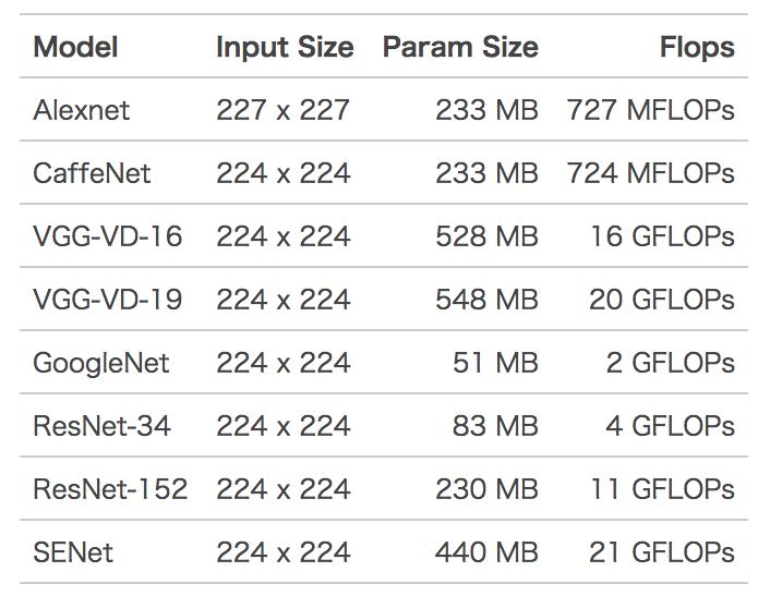 上表列举了,ImageNet图像识别中常见算法的模型大小以及单张图片一次训练(One Pass)所需要的计算量。