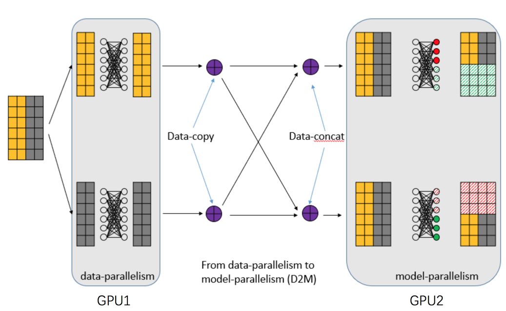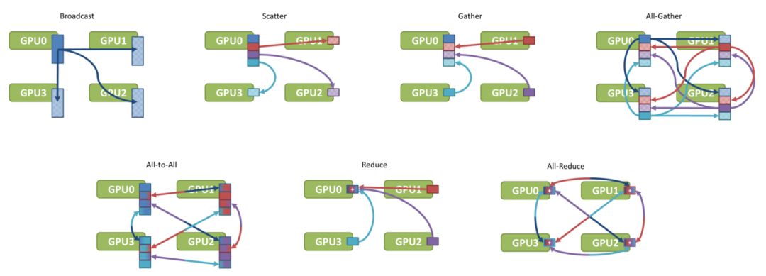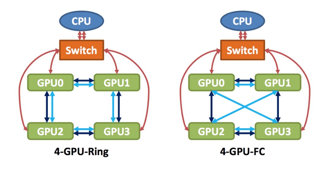 根据上面的数据结果,我们似乎可以得出一个结论:PCI-E和网络的传输耗时,相对于GPU来说,整整少了一个数量级,所以网络通信同步的时间可以忽略不计。然而问题并没有那么简单,上面例子中的耗时只是单个模型的耗时,但是对于8卡的集群来说,如果使用数据并行,每次同步就需要传输8份模型,这就导致数据传输的时间和GPU的计算时间“旗鼓相当”。这样的话,GPU就得每训练完一个Mini-batch,都得等候很久的一段时间(采取同步更新),这会浪费很多计算资源。因此,网络通信也需要制定对应的解决方案。下面我们以Nvidia NCCL中单机多卡的通信解决方案为例介绍,而多机多卡的通信解决方案其实是类似的。