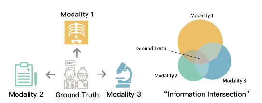 比起仅仅利用单个模态的数据,融合多个模态的数据信息能够训练出更加准确且鲁棒的分类器。比如,模型可以用X光图片、临床指标等数据来预测病人的身体情况。但是在实际中,多模态的精标注数据十分昂贵,往往只能在每个模态上获取少量标注数据。如何利用少量的多模态标注数据来高效地训练分类器成为一个关键问题。