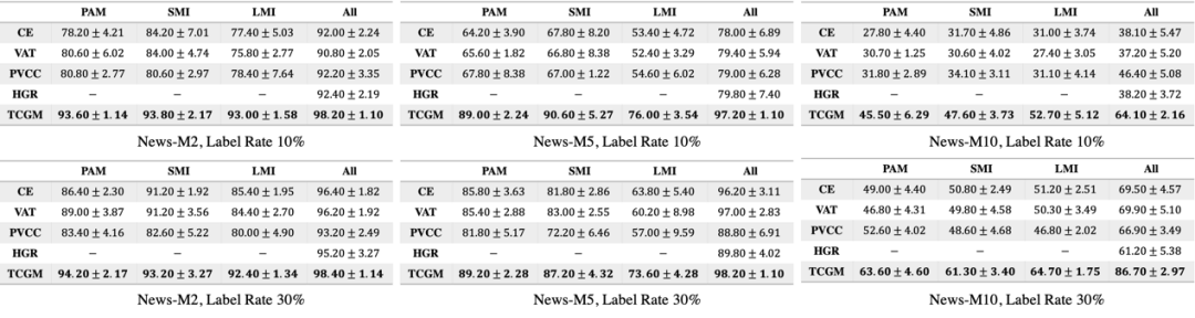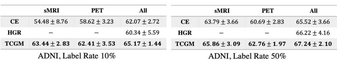 我们的方法 TCGM(Total Correlation Gain Maximization)在不同的标注比例下的半监督+多模态学习中都取得较好效果。在训练中,不仅单个模态的分类器表现得到提升,在利用所有分类器来预测标注的情况下,TCGM 也好于其他方法。