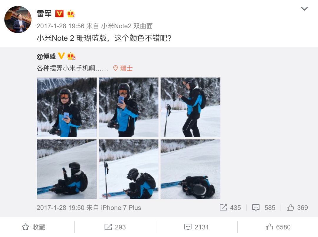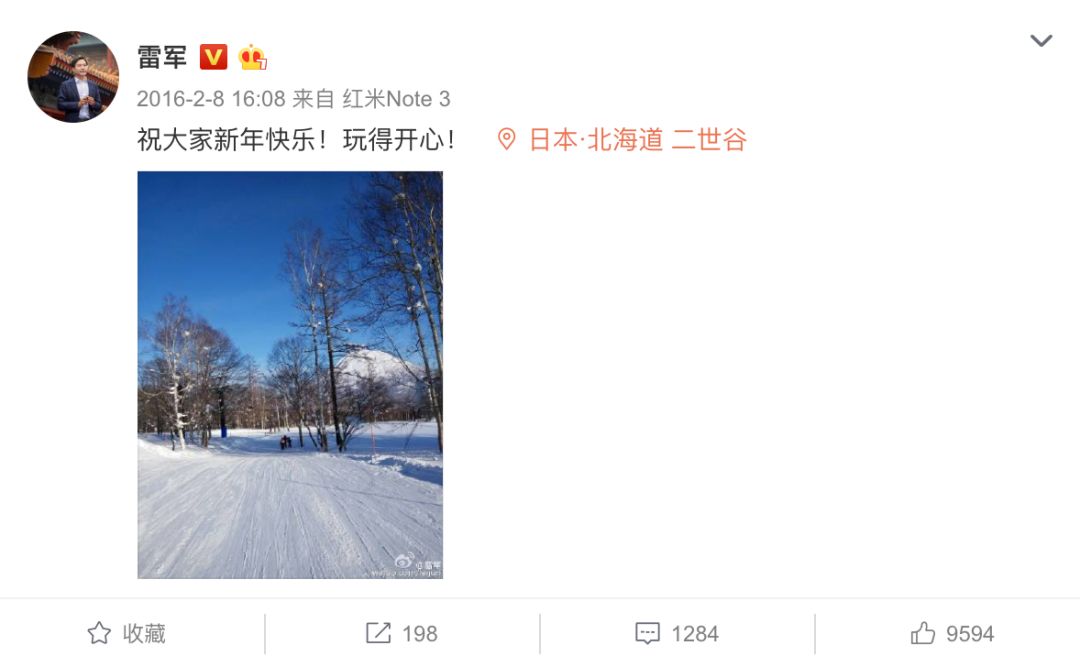 最近三年来,雷军分别去了北海道二世谷滑雪场、瑞士圣莫里茨滑雪场、奥地利基茨比厄尔滑雪场。2017年在瑞士滑雪时,好友傅盛也一起来了,发微博调侃他“滑雪也不忘摆弄小米手机”。(2018年小米在港交所敲钟,上市后,雷军的压力应该会更大,那么我们来猜一猜,今年,雷军会去哪里滑雪减压呢?)